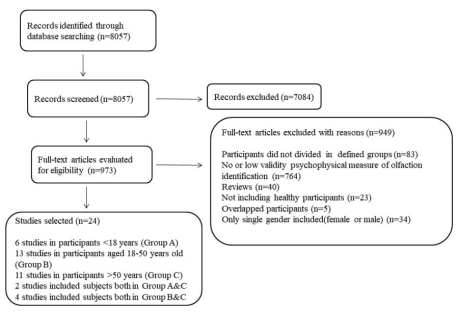 使用了“olfac*(嗅觉*)”或“smell(气味)”和“gender (性别)”或“sex(性)”等术语在PubMed数据库中的研究从一开始到2017年8月都进行搜索。计算每次比较的效果大小。这项元分析分析纳入了24项研究。