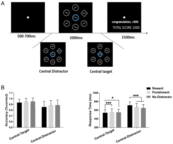 图2.实验二流程图和数据结果。(A)刺激材料与实验流程图。(B)目标呈现在中心和分心物呈现在中心的正确率(左图),目标呈现在中心和分心物呈现在中心的反应时(右图)(*p< 0.05;***p< 0.001)。