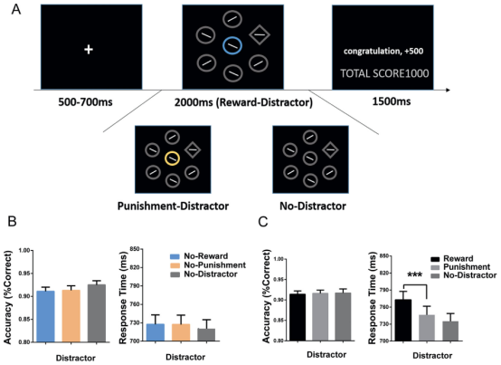 图1.实验一流程图和数据结果。(A)刺激材料与实验流程图。(B)控制组的正确率和反应时。(C)实验组的正确率和反应时(***p< 0.001)。