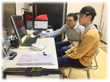 ▲胡杨博士(远)与研究助理唐炎程(近)在脑成像中心实验室进行程序调试。