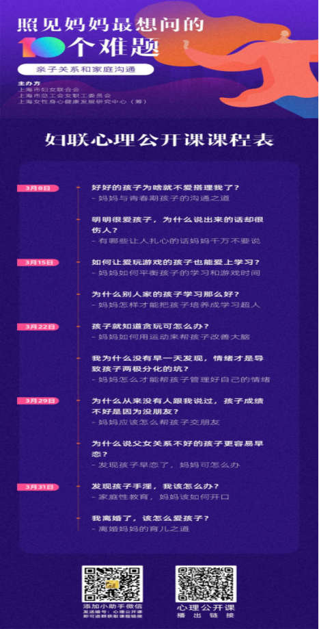 今年的“三八”节期间,上海市妇联、市总工会女职工委员会以及上海女性身心健康发展研究中心(筹),为妈妈们精心准备了10堂心理公开课。