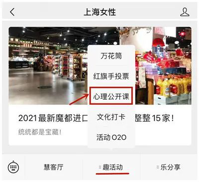 关注“上海女性”微信公众号,点击底部菜单栏“趣活动”-“心理公开课”按钮